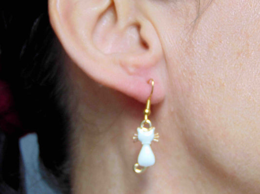 Short earrings with small shiny enamelled white cats, gold-toned stainless steel hooks