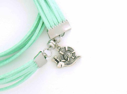 Wrap bracelet in mint green faux suede, happy snail pewter charm, magnetic stainless steel clasp