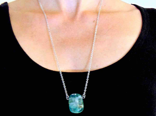 28-inch necklace with funky cylinder, dark turquoise-gray marbled pattern (Murano-style glass handmade in Montreal), matching pendants, stainless steel chain