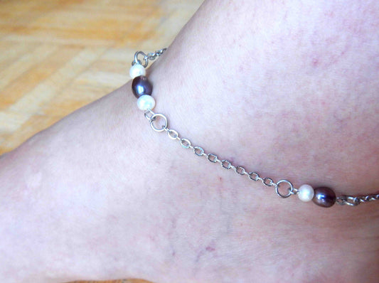 Anklet with natural white freshwater pearls and Swarovski crystals on hypoallergenic stainless steel chain