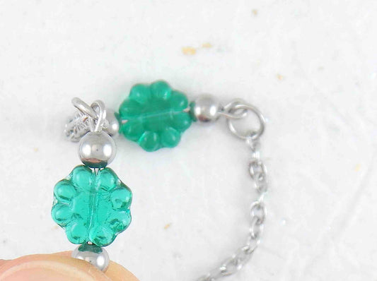 Anklet with tiny Czech glass flowers in 3 colours (yellow, plum, green), hypoallergenic stainless steel chain