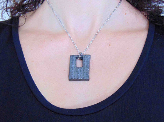 16-inch necklace with black nickel rectangular ceramics pendant handmade in Montreal, stainless steel chain