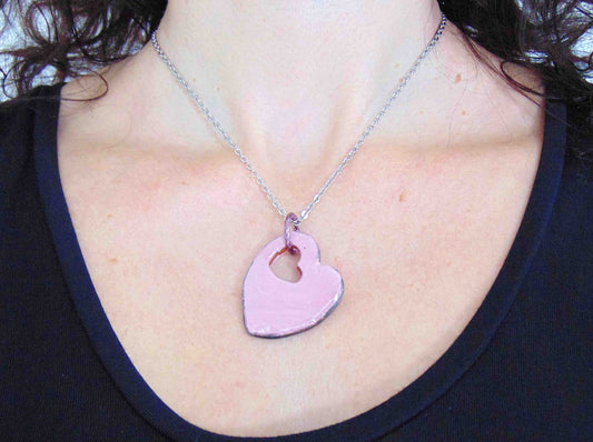 17-inch necklace with pink heart ceramic pendant handmade in Montreal, stainless steel chain