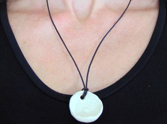 24-inch necklace with off-white ceramic sea urchin pendant handmade in Montreal, black leather cord, stainless steel clasp
