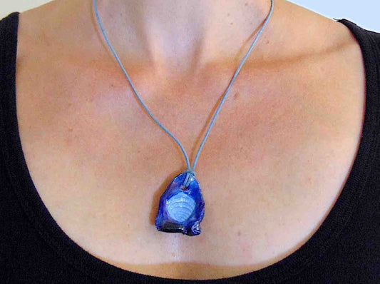 20-inch necklace with indigo blue-toned ceramic pendant necklace handmade in Montreal, shell imprint, blue leather cord, stainless steel clasp