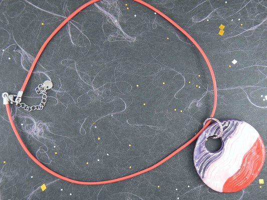 16-inch necklace with large round wavy ceramic pendant medallion handmade in Montreal in violet-pink-red, red leather cord, aluminum ring, stainless steel clasp