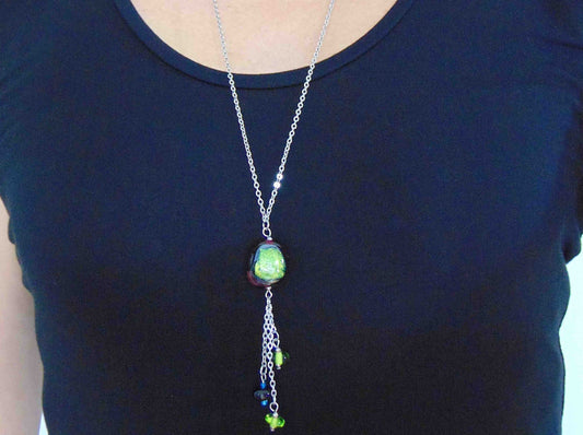 27-inch necklace with funky glass bead and matching pendants in dark red-lime green-black (Murano-style glass handmade in Montreal), stainless steel chain