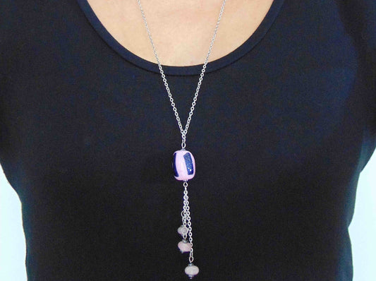 14-inch necklace with pale lilac glass cylinder, dark blue stripes (Murano-style glass handmade in Montreal), stainless steel chain