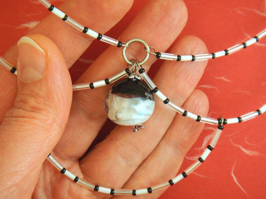 15-inch signature necklace with articulated black and white hoops and lampworked glass bead (Murano-style glass handmade in Montreal)