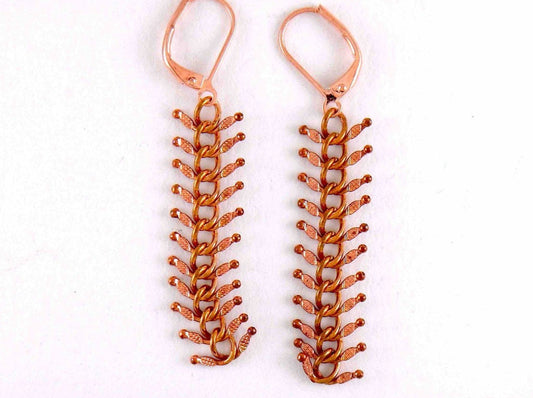 Long earrings with centipede-shaped rose gold chain, rose-gold plated metal lever back hooks