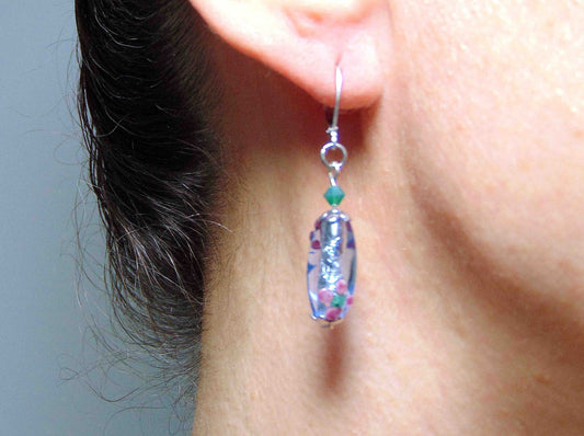 Short earrings with clear blue glass cylinders, silver foil and tiny pink flower details, opal green Swarovski crystals, stainless steel lever back hooks