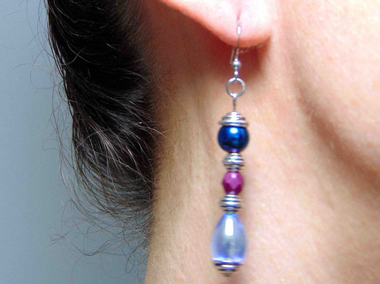 Long earrings with iridescent blue teardrops, metallic blue and faceted mauve balls, stainless steel hooks