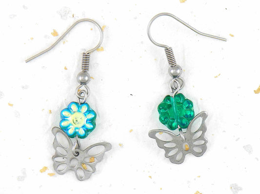 Short earrings with stainless steel butterflies and iridescent green Czech glass flowers, stainless steel hooks