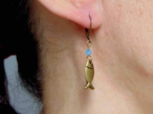 Short earrings with stylized brass fish and bright turquoise Swarovski crystals, brass lever back hooks