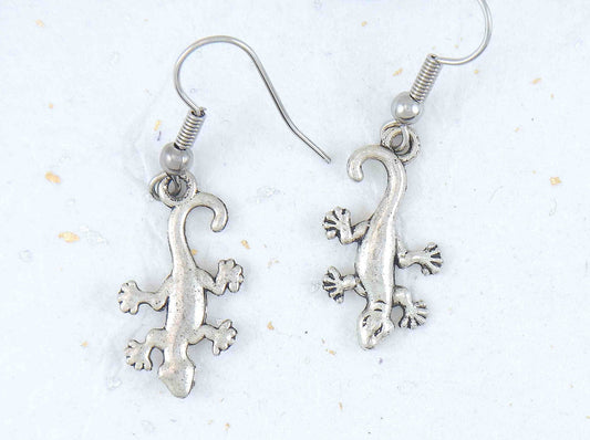 Short earrings with small pewter jumping fish and iridescent hematite hearts, stainless steel lever back hooks