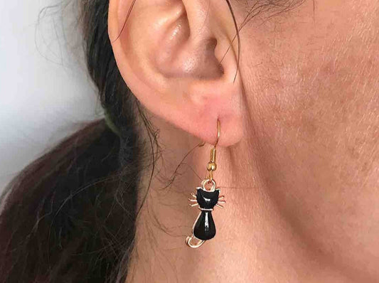 Short earrings with small shiny enamelled black cats, gold-toned stainless steel hooks