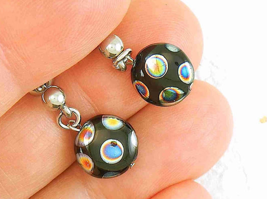 Short earrings with small shiny black round Czech glass pebbles, small multicoloured dots, stainless steel posts