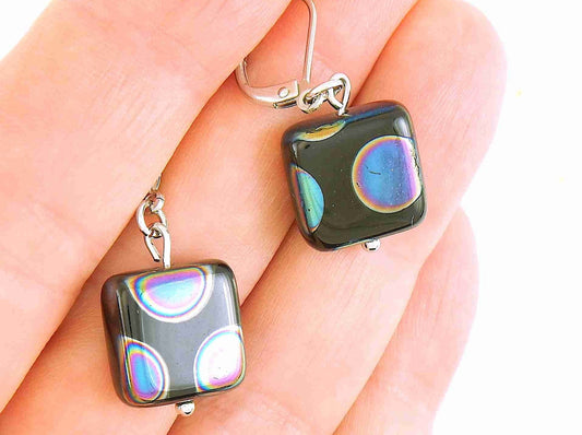 Short earrings with small shiny black Czech glass squares, large silver/copper/multicoloured dots, stainless steel lever back hooks