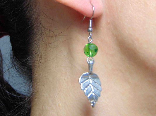 Long earrings with pewter leaves and green faceted crystal balls, stainless steel hooks