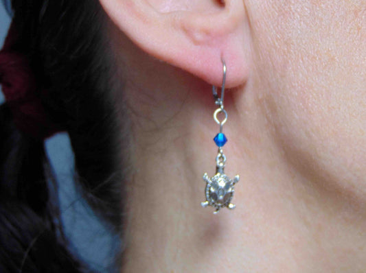 Long earrings with small silver turtles and metallic blue Swarovski crystals, stainless steel lever back hooks