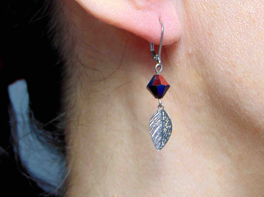 Long earrings with tiny silver leaves and iridescent black Swarovski crystals, stainless steel lever back hooks