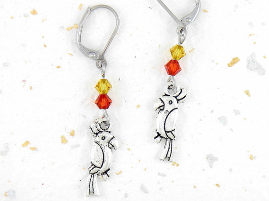 Long earrings with small pewter cockatoos (parrots) and Swarovski crystals, stainless steel lever back hooks