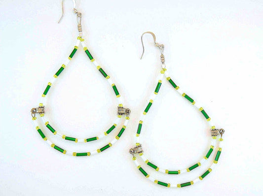 Long statement earrings with original hoop design in white and green, metal hooks