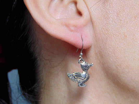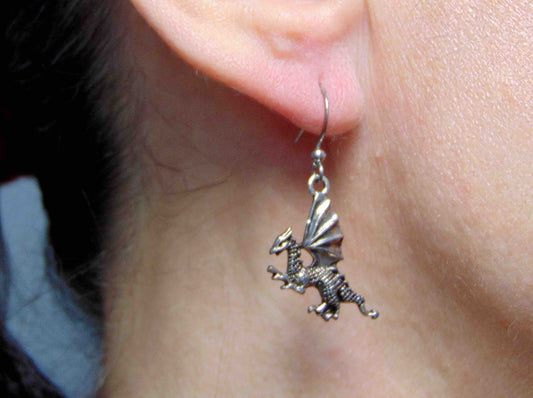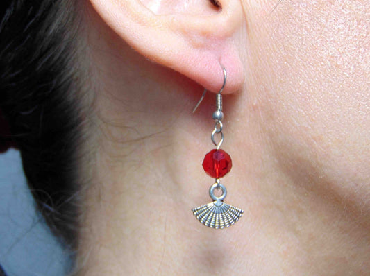 Long earrings with tiny pewter fans and red crystal balls, stainless steel hooks