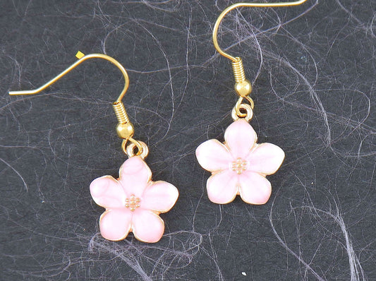 Short earrings with enamelled cherry blossoms (sakura) in 4 pastel colours (white, lilac, pink, blue), gold-toned stainless steel hooks