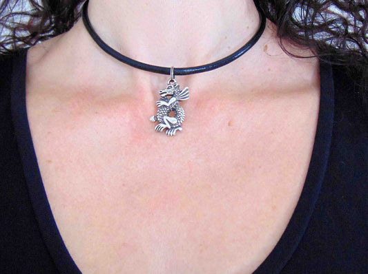 Choker necklace with pewter dragon pendant on black leather, stainless steel clasp