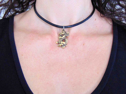 Choker necklace with gold-toned pewter dragon pendant on black leather, stainless steel clasp