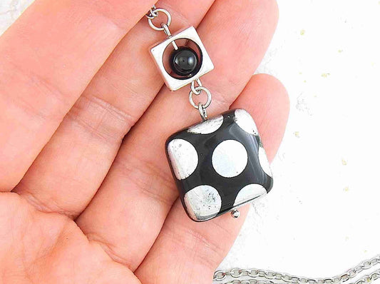 25-inch necklace with black Czech glass square, copper or silver polka dots, matching stainless steel chain