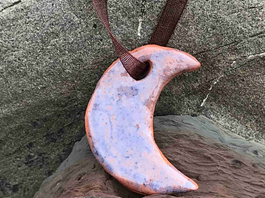 Ornament with jean blue ceramics half moon handmade in Montreal, chocolate brown organza ribbon