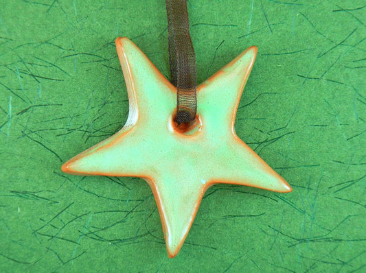 Ornament with mint green and terracotta ceramics star handmade in Montreal, chocolate brown organza ribbon