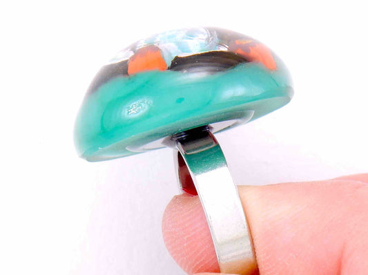 Finger ring with large round emerald green cabochon (Murano style glass handmade in Montreal), orange-white-black flowers, stainless steel adjustable base (US 7-8)