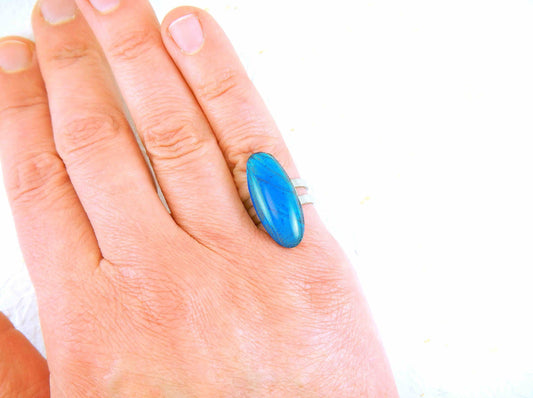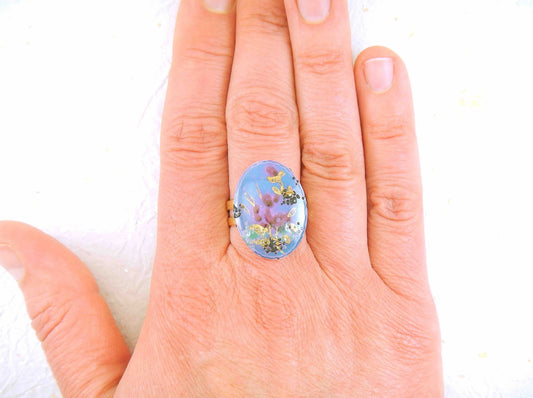Finger ring with bright turquoise long oval vintage glass cabochon, butterfly wing pattern, adjustable stainless steel base