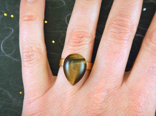 Finger ring with drop-shaped golden tiger eye stone cabochon, gold-toned hypoallergenic stainless steel adjustable base (US 7-8)