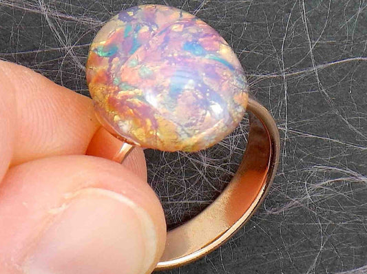 Finger ring with imitation "opal" vintage glass cabochon, adjustable rose gold-toned stainless steel base