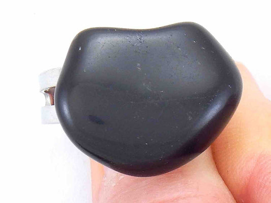 Finger ring with large smooth baroque black obsidian stone cabochon, stainless steel adjustable base