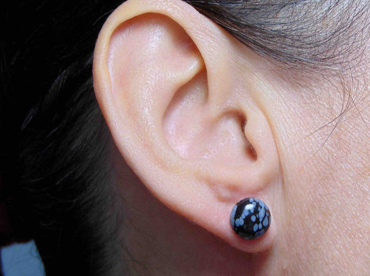Ear studs with 10mm round snowflake obsidian stone cabochons, stainless steel posts