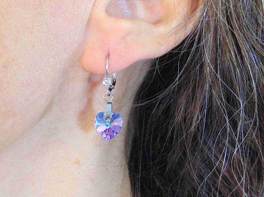 Short earrings with 10mm faceted Vitrail Light (sky blue and lilac) Swarovski crystal hearts, stainless steel lever back hooks with tiny clear crystals