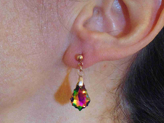 Short earrings with 16mm Vitrail Medium (pink/green) baroque Swarovski crystals, rose gold-toned stainless steel studs
