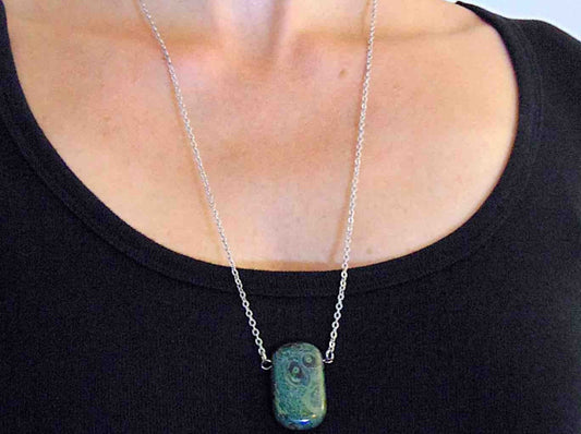 15-inch necklace with oval blue-green marbled chrysocolla stone, stainless steel chain chain