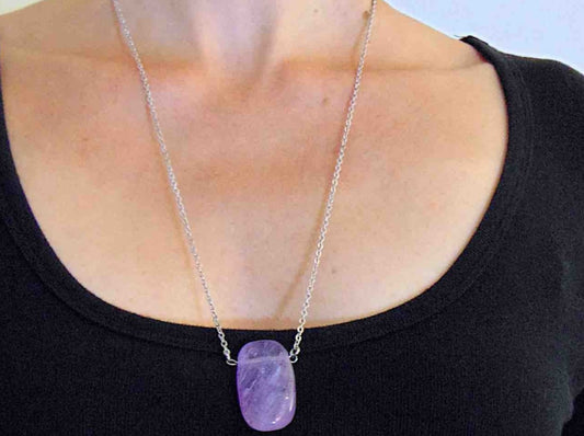 26-inch necklace with rectangular smoky light violet amethyst stone pendant, stainless steel chain