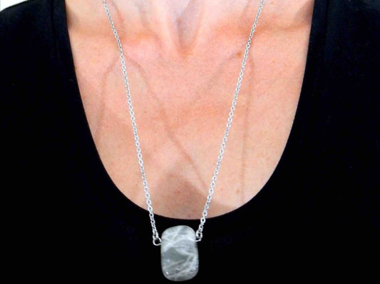 26-inch necklace with rectangular natural silver moonstone pendant, stainless steel chain