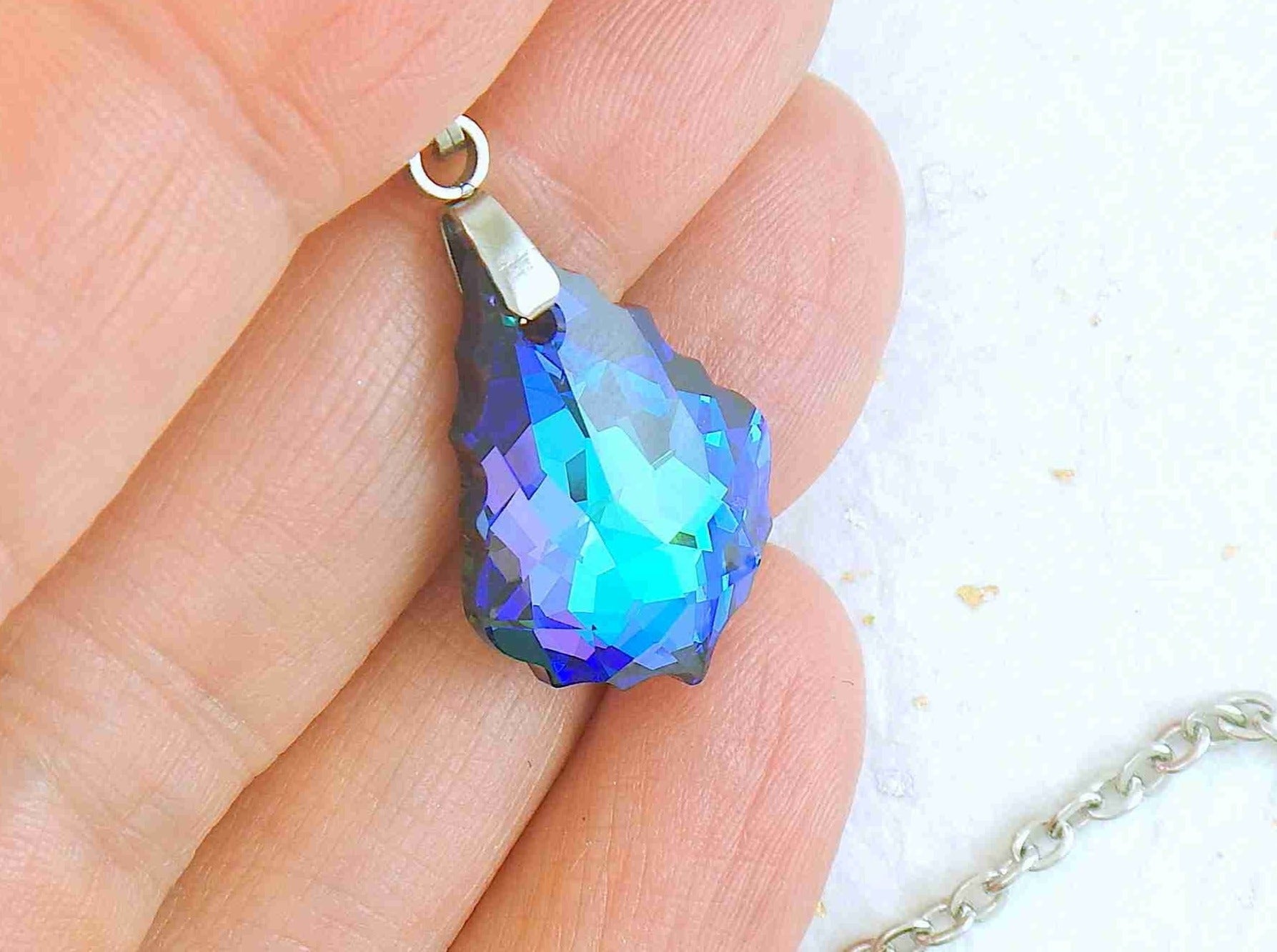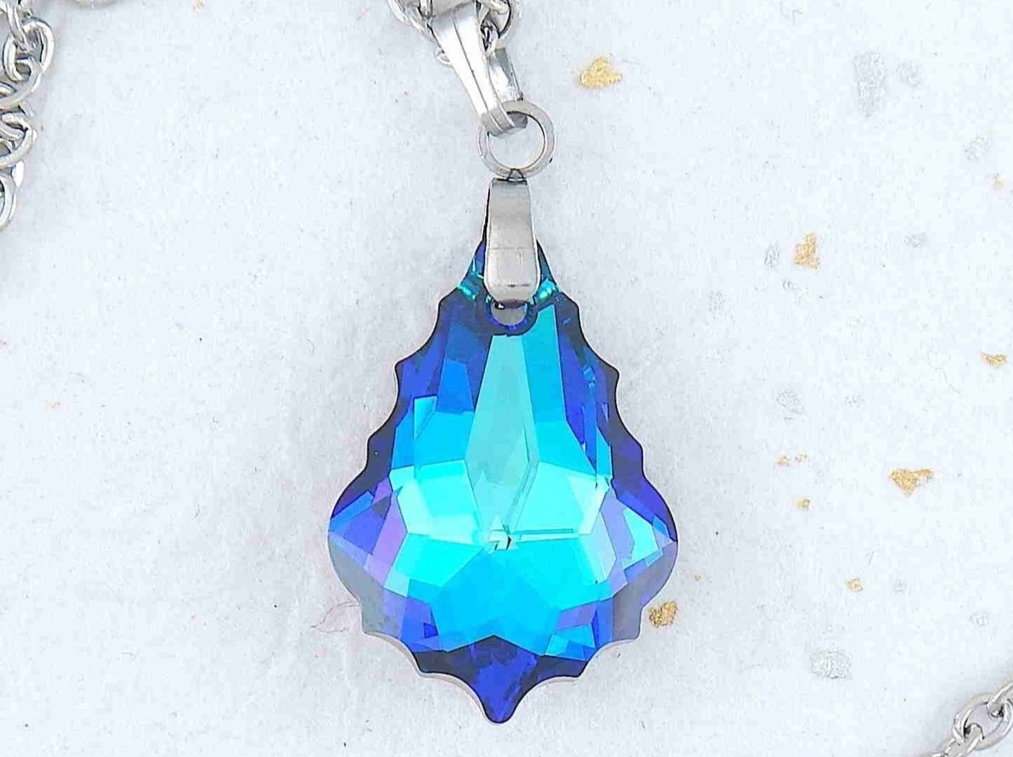 16-inch necklace with 22mm Heliotrope (turquoise, blue, violet) baroque Swarovski crystal pendant, stainless steel chain