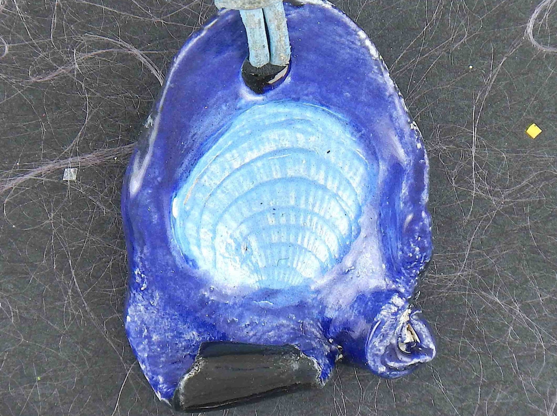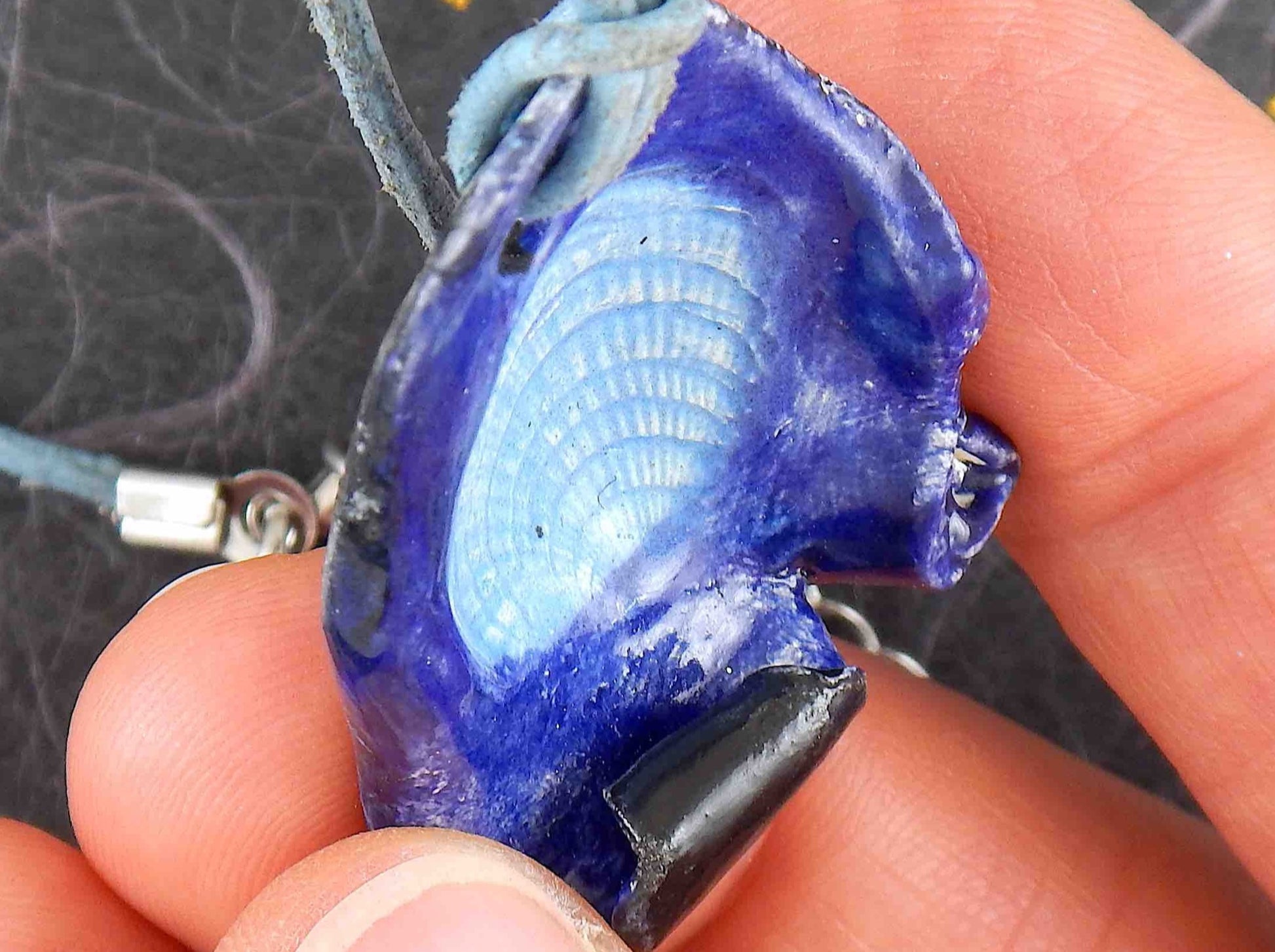 20-inch necklace with indigo blue-toned ceramic pendant necklace handmade in Montreal, shell imprint, blue leather cord, stainless steel clasp