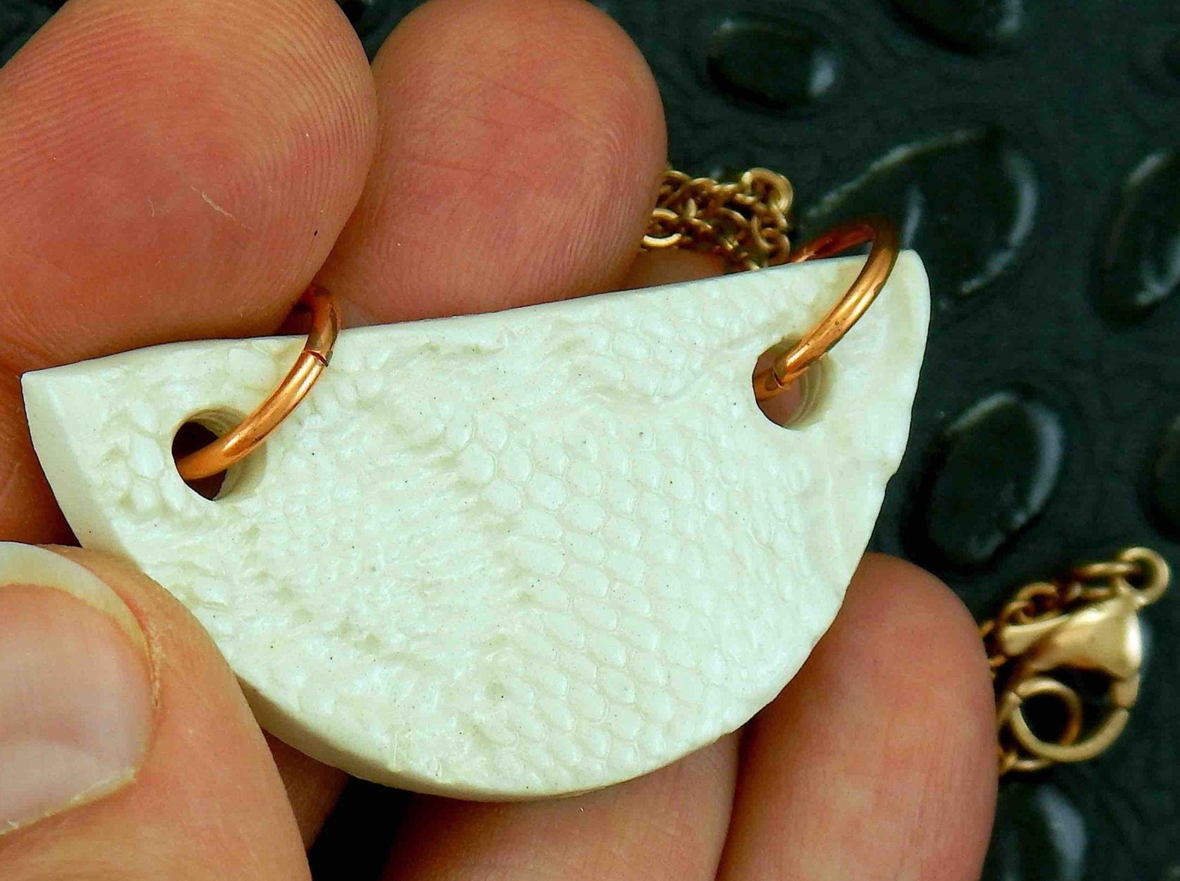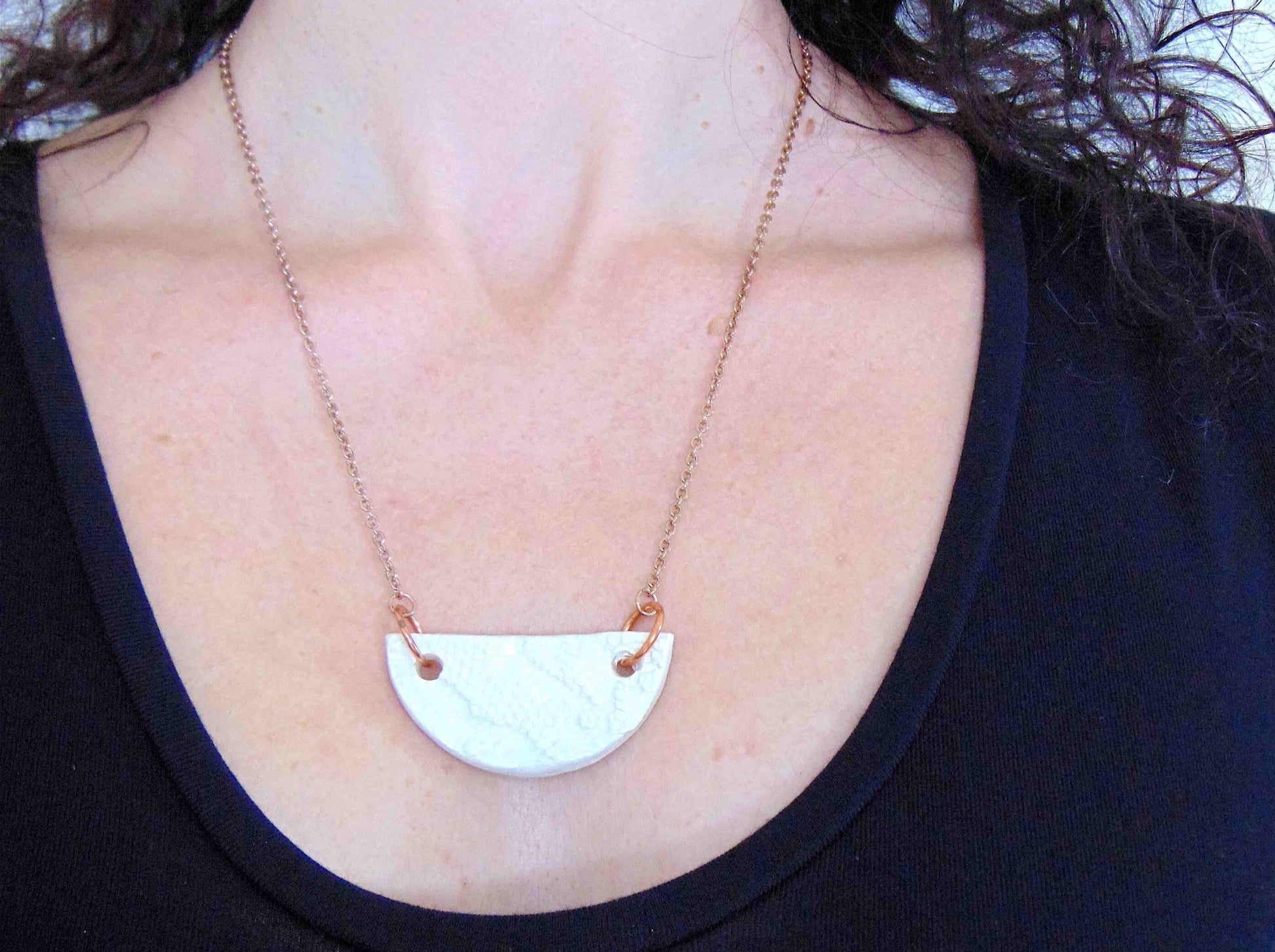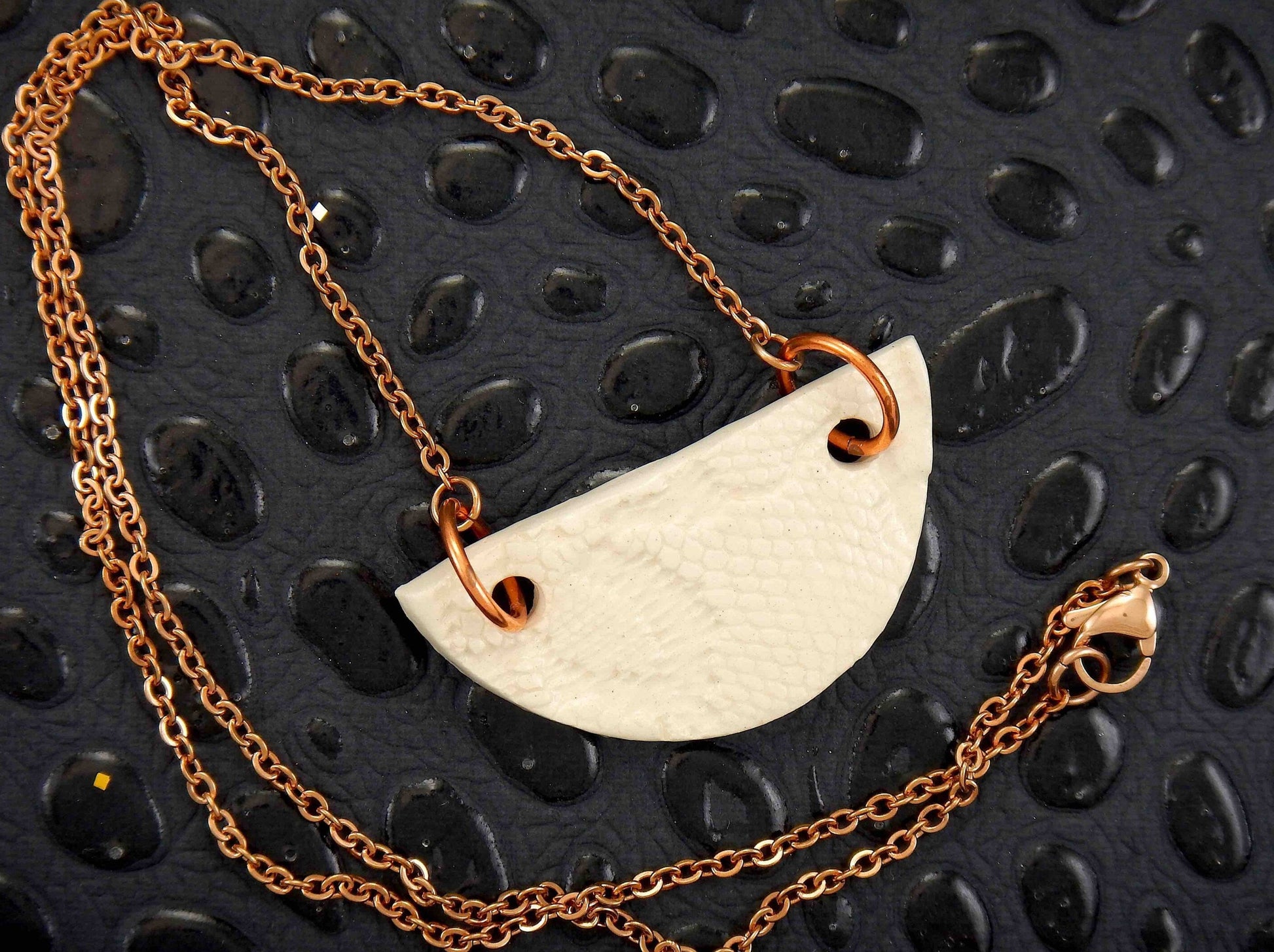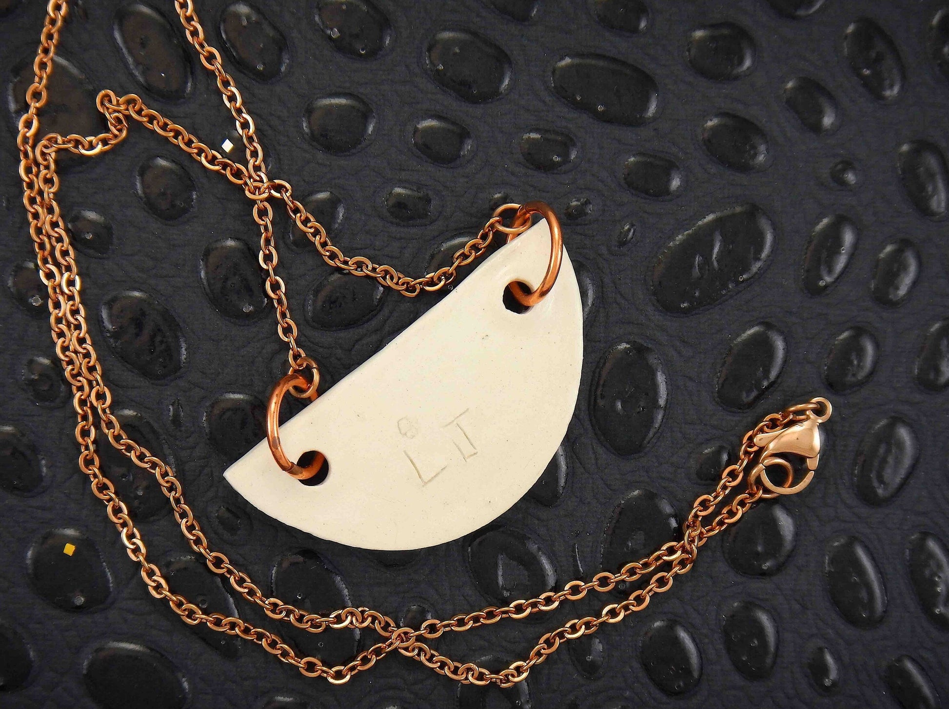20-inch necklace with off-white half-circle ceramics pendant handmade in Montreal, rose gold-toned stainless steel chain