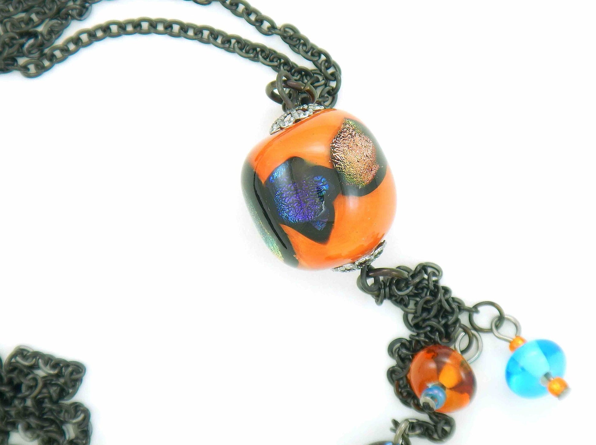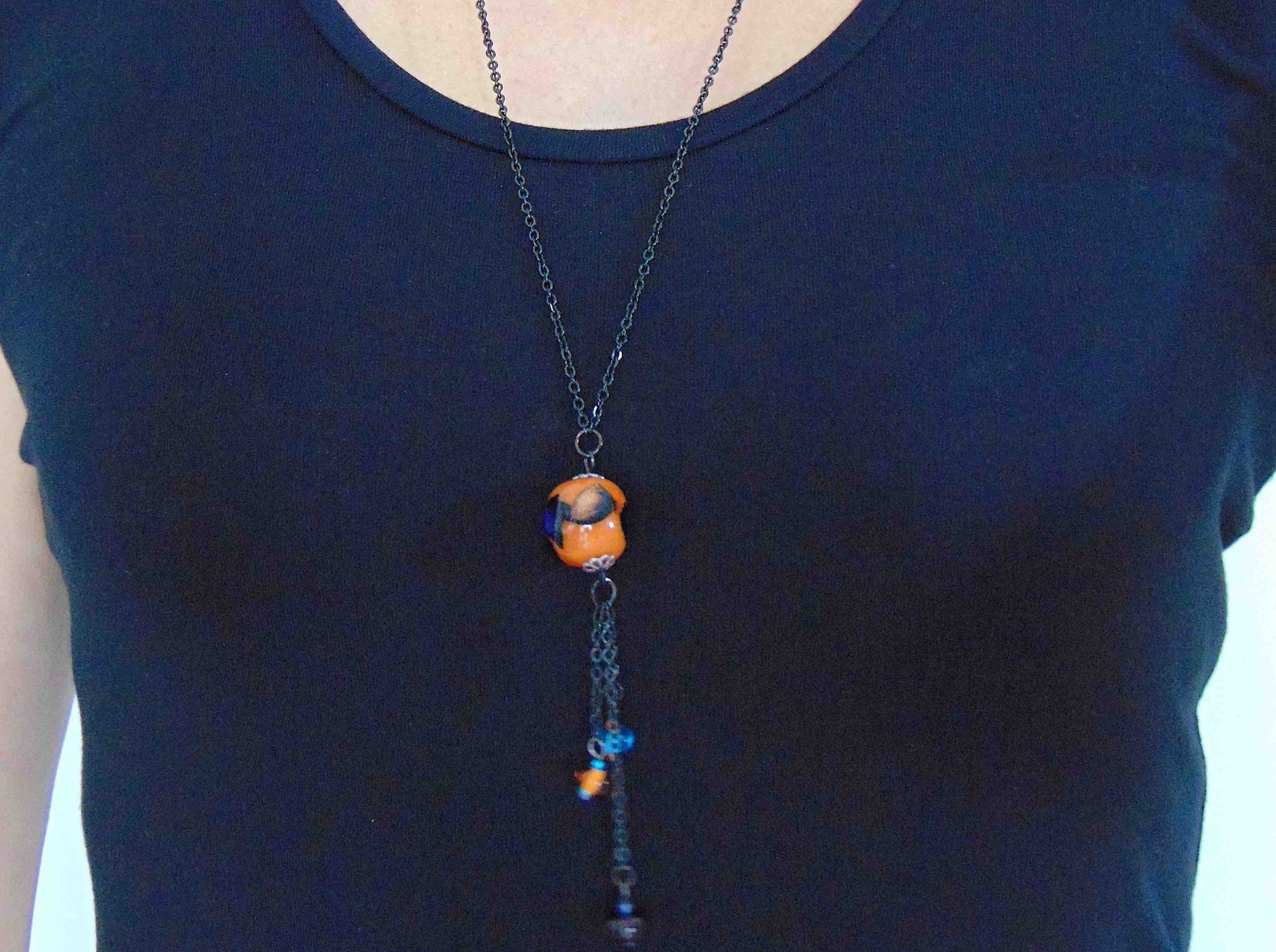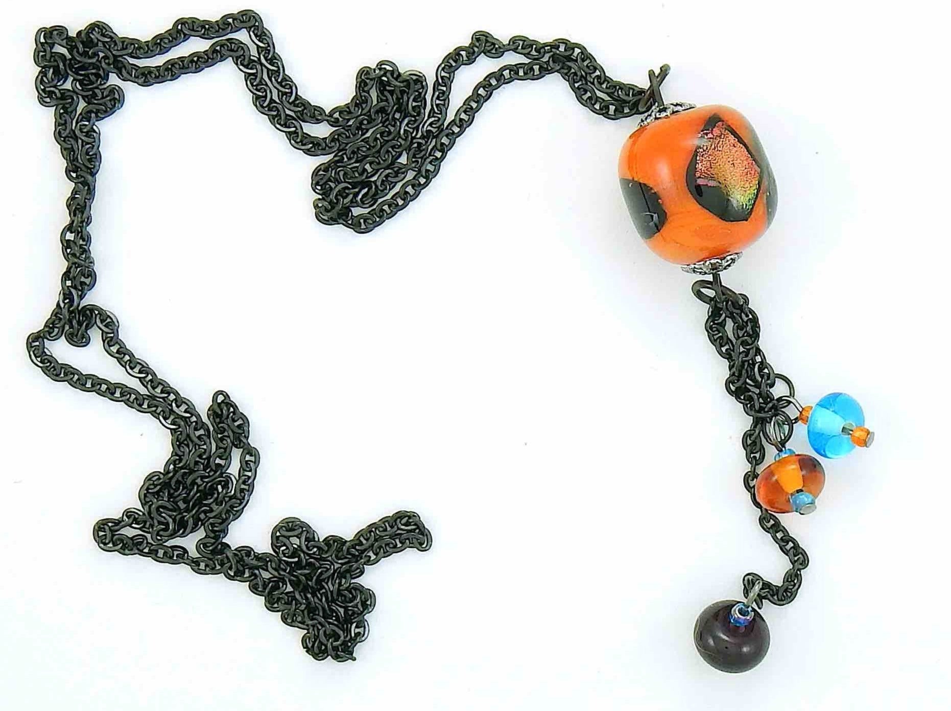 27-inch necklace with elongated glass ball and matching pendants in bright orange-black-blue (Murano-style glass handmade in Montreal), black stainless steel chain