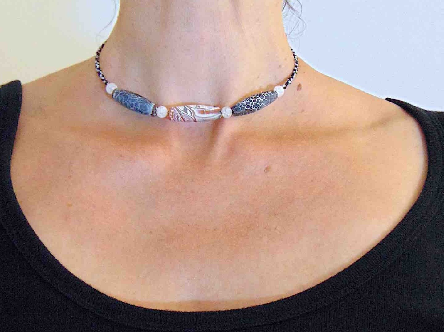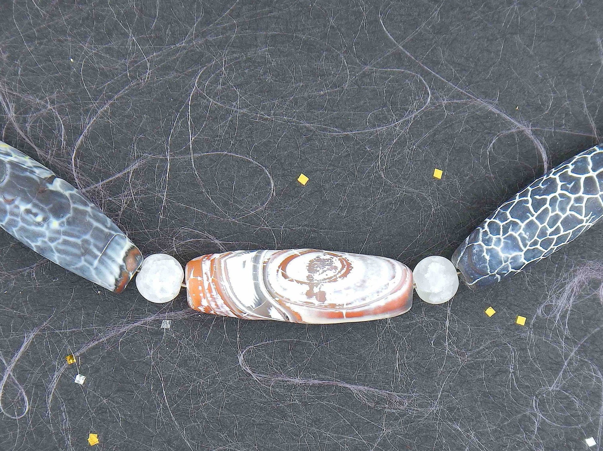 Choker necklace with 3 fire-cracked agate stone beads in black-caramel-white tones, stainless steel clasp